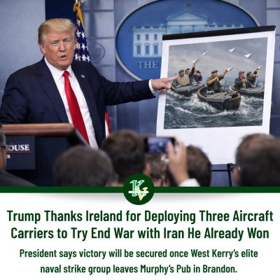 “I want to thank Ireland and West Kerry, tremendous people, great people,” Trump told reporters. “They’ve stepped up big time by sending three aircraft carriers. Nobody knew Ireland had this kind of military power.”