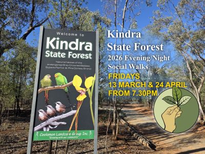 For this walk, we’ll meet at the main entrance to Kindra State Forest on Lewis Street at 7.30PM.